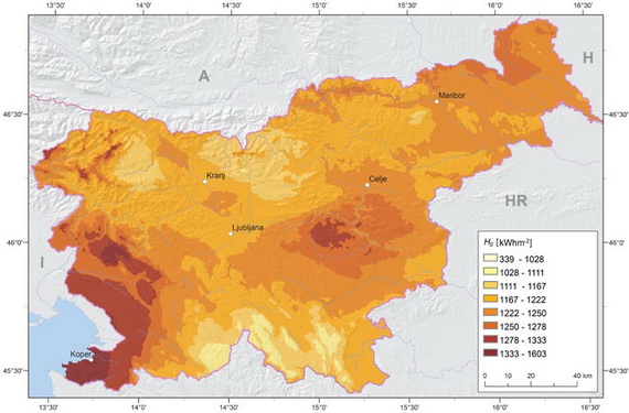 Globalno letno obsevanje na horizontalno površino v Sloveniji. (Vir: D. Kastelec, J. Rakovec, K. Zakšek, Sončna energija v Sloveniji, ZRC SAZU, 2007)